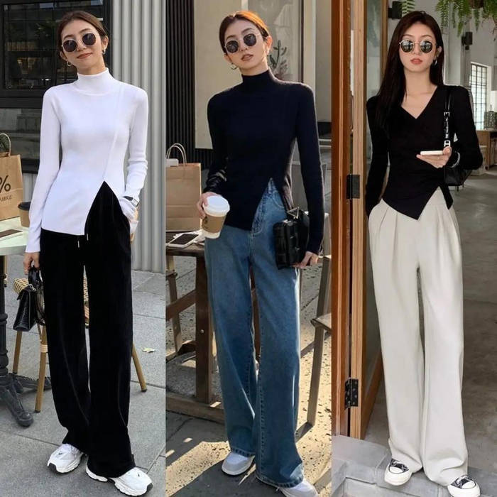 不过下面这样的穿搭方式对身材要求极高,一定是高挑纤瘦的女性才能驾驭得住这种穿衣风格,修身款的针织上衣搭配上比较有垂坠感的长裤,西装裤,牛仔裤,再搭配上运动鞋,帆布鞋,小板鞋,才能穿出这种慵懒随性的效果。