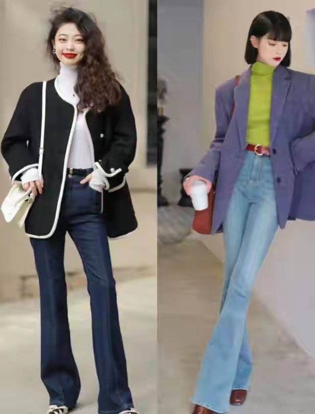 身材偏瘦的女性,可以选择松紧的穿搭方式,能更好的展现你的好身材,例如下面紫色的西服外套,内搭修身款的绿色针织衫,下半身是一条修身的微喇叭牛仔裤,脚上穿了一双棕色的低跟皮鞋,