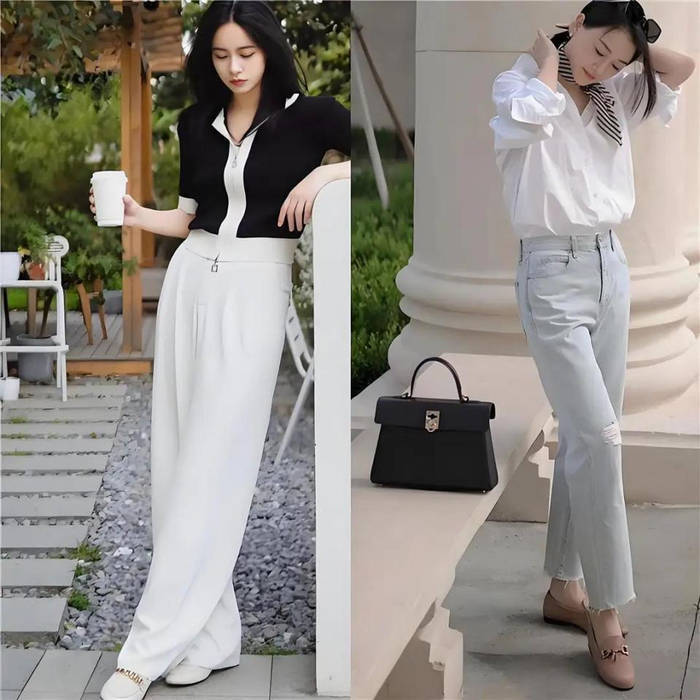 如果想要比较百搭的,直接选择乐福鞋下面这种白色的乐福鞋和棕色的乐福鞋搭配上牛仔裤,西装裤都可以,让你显得简约大气。