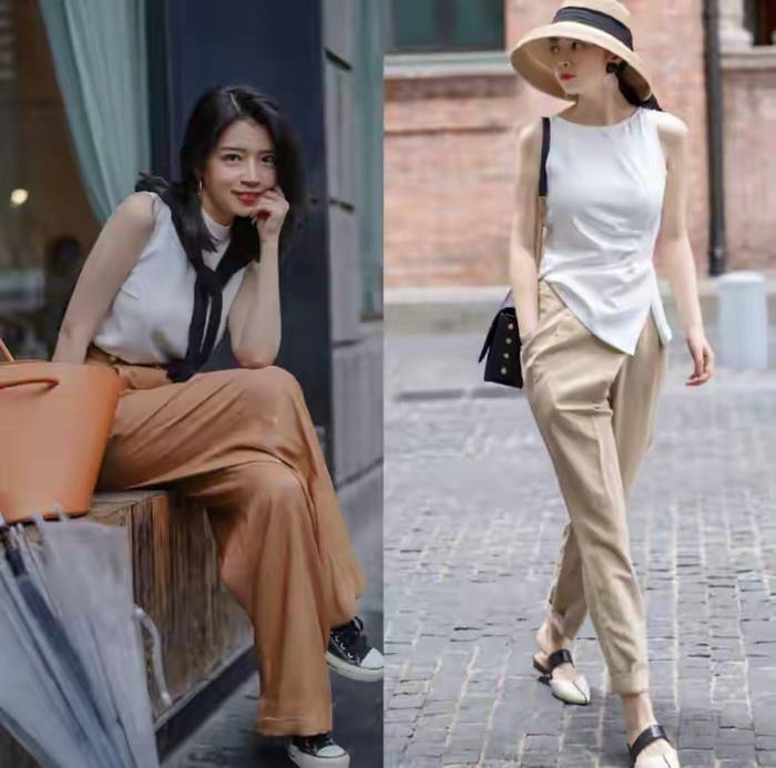 短袖的款式也很多,看你如何选择,例如下面用黑色的针织短袖搭配上白色的直筒裤,这样的黑白色彩搭配经典耐看。