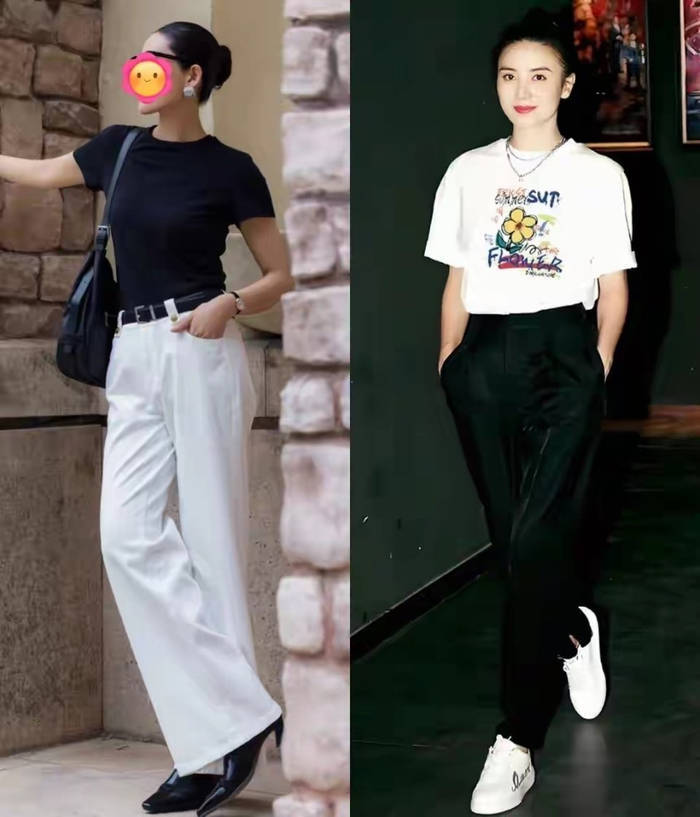 你也可以选择像宋佳一样,用一件日常常见的印花短袖T恤,搭配上黑色的直筒长裤,脚上穿了一双小白平底鞋,扎的一款高高的丸子头发型,这样的穿搭很有活力,也显年轻。