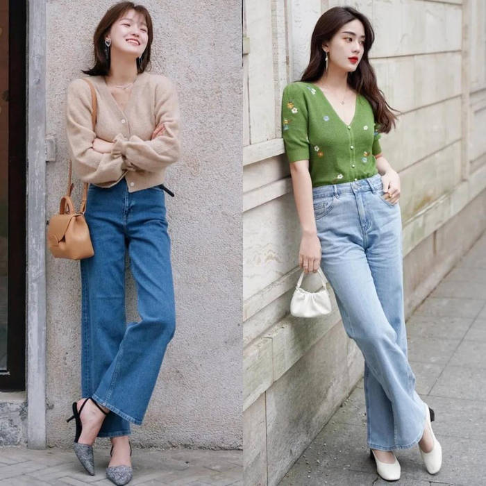 例如,下面用一件杏色的针织开衫,搭配上一条蓝色的牛仔直筒裤,脚上穿了一双黑色的高跟鞋,这样的打扮是不是很适合咱们普通大众女性借鉴?